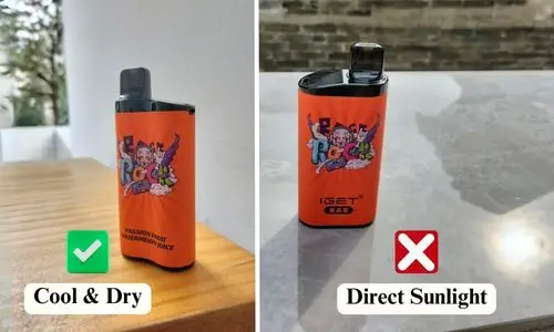 Away from heat sources and direct sunlight: To prevent the vape from overheating and getting automatic shutdown.